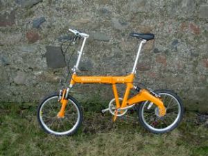 Bicycles! They’re great! I used to have two in Aberdeen for my regular sojourns there, but they both got nicked from the BBC’s supposedly secure bike park (not only that, but not a single person who works at the Beeb in Aberdeen noticed they’d gone; or the freshly-sawn chains lying on the ground). I still have one at a secret location in Glasgow. It reassures me to think of it, waiting there, poised for a swift run out to Loch Lomond…anyway…this is my latest acquisition. A bike for tucking under one’s arm when one gets too tired, and hopping aboard a passing plane, train or automobile.