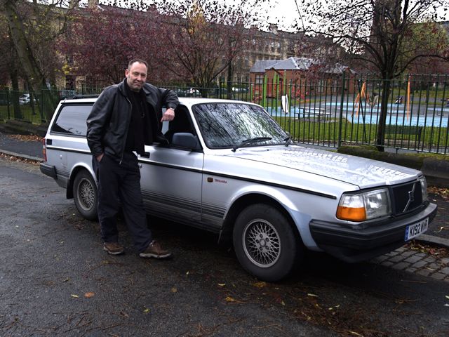 Phenergan elixir meant I was dozy, but the movement was so marked it was impossible to sleep for long. Anyway, I’m home, and with the Volvo Torslanda too! Here’s a picture of the mighty £390 car by my old mate Stewart Cunningham, nicked from his blog, which is well worth checking out, along with a snap of Boo Hewerdine (formerly of The Bible, and currently Eddi Reader’s guitarist and songwriting cohort). Boo played at Bar Brel in Glasgow on Wednesday night, which was also No Music Day. Guess I betrayed its spirit, though having done a totally music-free two hour show in the afternoon, I think I deserved a break.