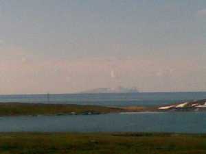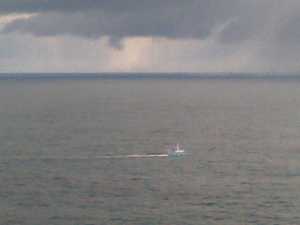 Took Lulu the St Bernard out for a walk this morning up at the Eshaness cliffs. Ronnie was out checking his creels – that’s his boat – and while it was glorious to the west (Foula can be seen, glinting in the distance) more snow showers were coming in from the north, and Ronnie was racing them back to harbour.