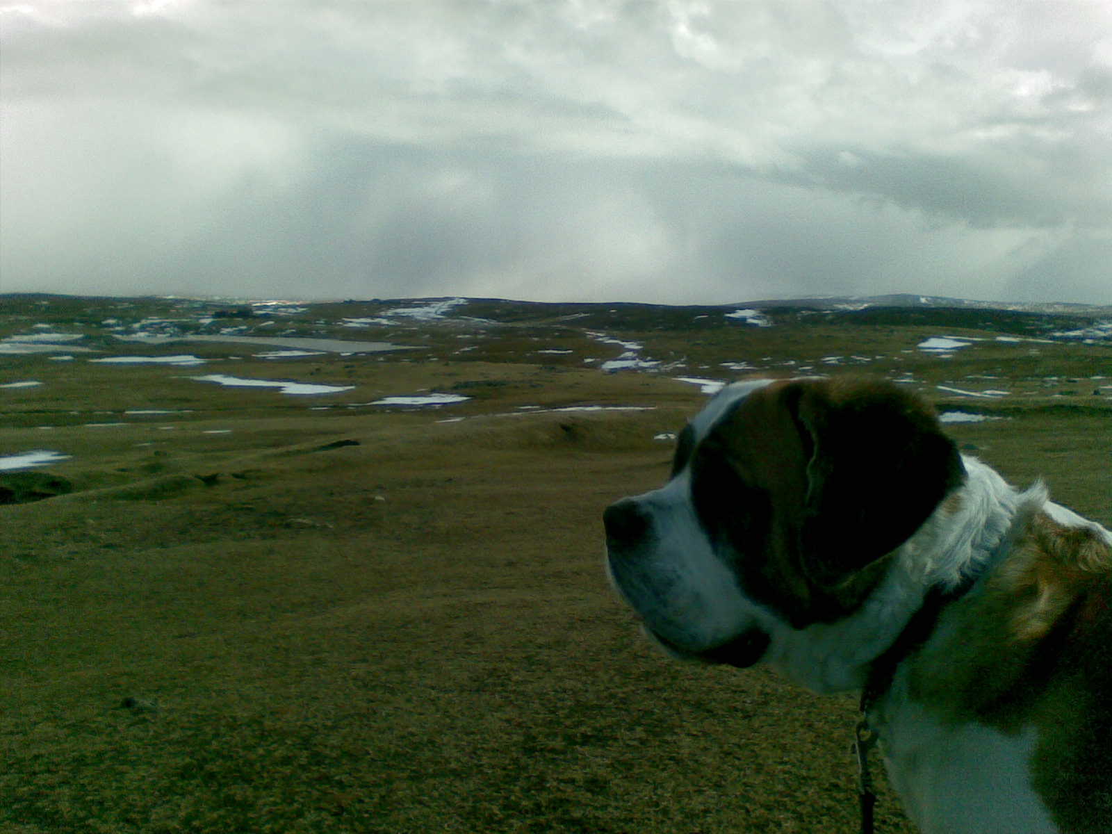 Took Lulu the St Bernard out for a walk this morning up at the Eshaness cliffs. Ronnie was out checking his creels – that’s his boat – and while it was glorious to the west (Foula can be seen, glinting in the distance) more snow showers were coming in from the north, and Ronnie was racing them back to harbour.