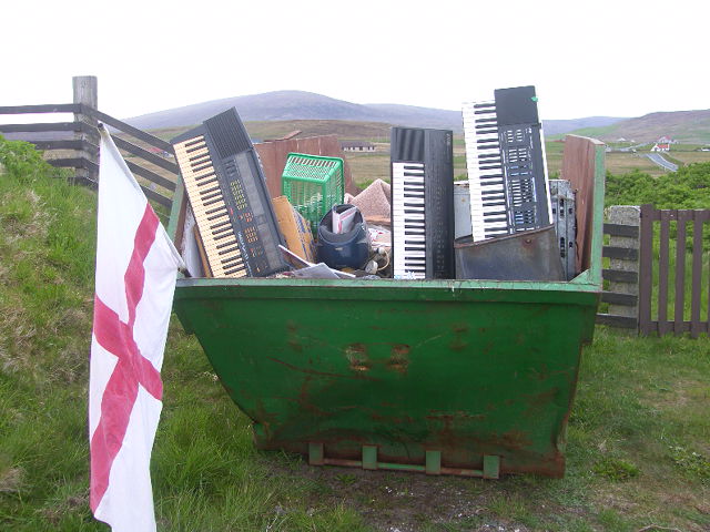 I’ve just checked, and as of this afternoon, it’s all still there: three keyboards, a crash helmet, two desktop computers (you can just see the towers) and an English flag (or Cross of St George if you prefer), complete with pole. This is how I found the skip last night, just along from the Radiocroft but with absolutely nothing to do with me. Who dumped the stuff? What story does it all tell? Rick Wakeman’s great house-cleaning following his move to Shetland? You decide…