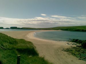 St Ninian’s Isle in Shetland’s South Mainland, yesterday. Mediterranean conditions (which means a survival time in the sea of, oh, 20 minutes). A tombolo is a double-sided beach. I think this is the largest in Europe.