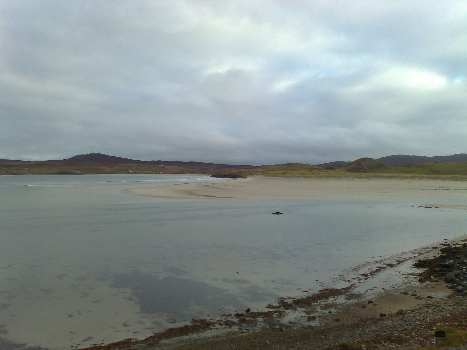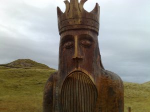 The oak sculpture of a Lewis Chessman is by Stephen Hayward, and is sited near where that legendary set was found, in a stone chest covered by a sand dune. The beach at Ardriol, seen here from Carnish, is fantastic.