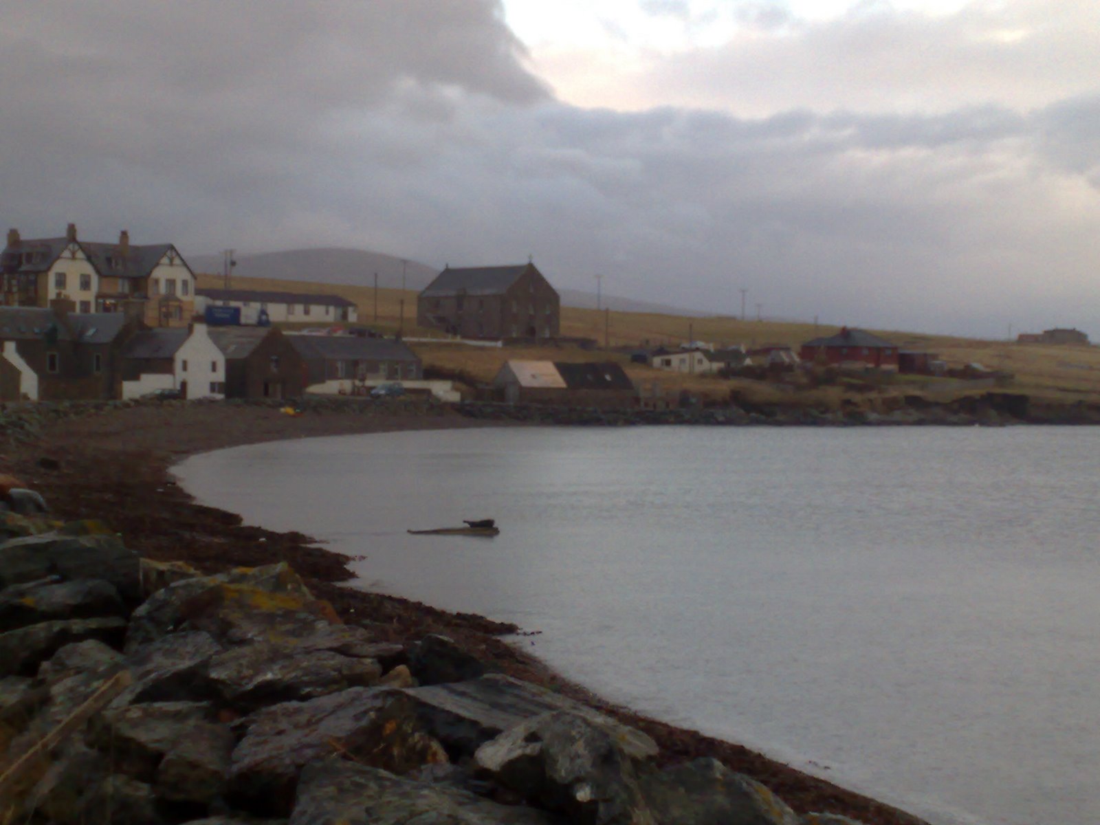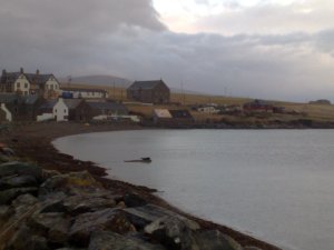 This was the scene at 11.00am this morning, looking from our house to Hillswick. And yes, that IS a seal balancing on the tidal drain.