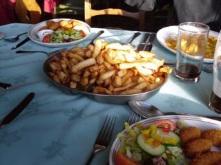 Today, though, we stayed put, with a couple of minor-league dogwalks and a fine lunch at the St Magnus Bay Hotel, where the chips are particularly wonderful and the portions are massive. I love scampi. A game of pool, a pint of Belhaven and two perfectly friendly sheepdogs on the lawn.