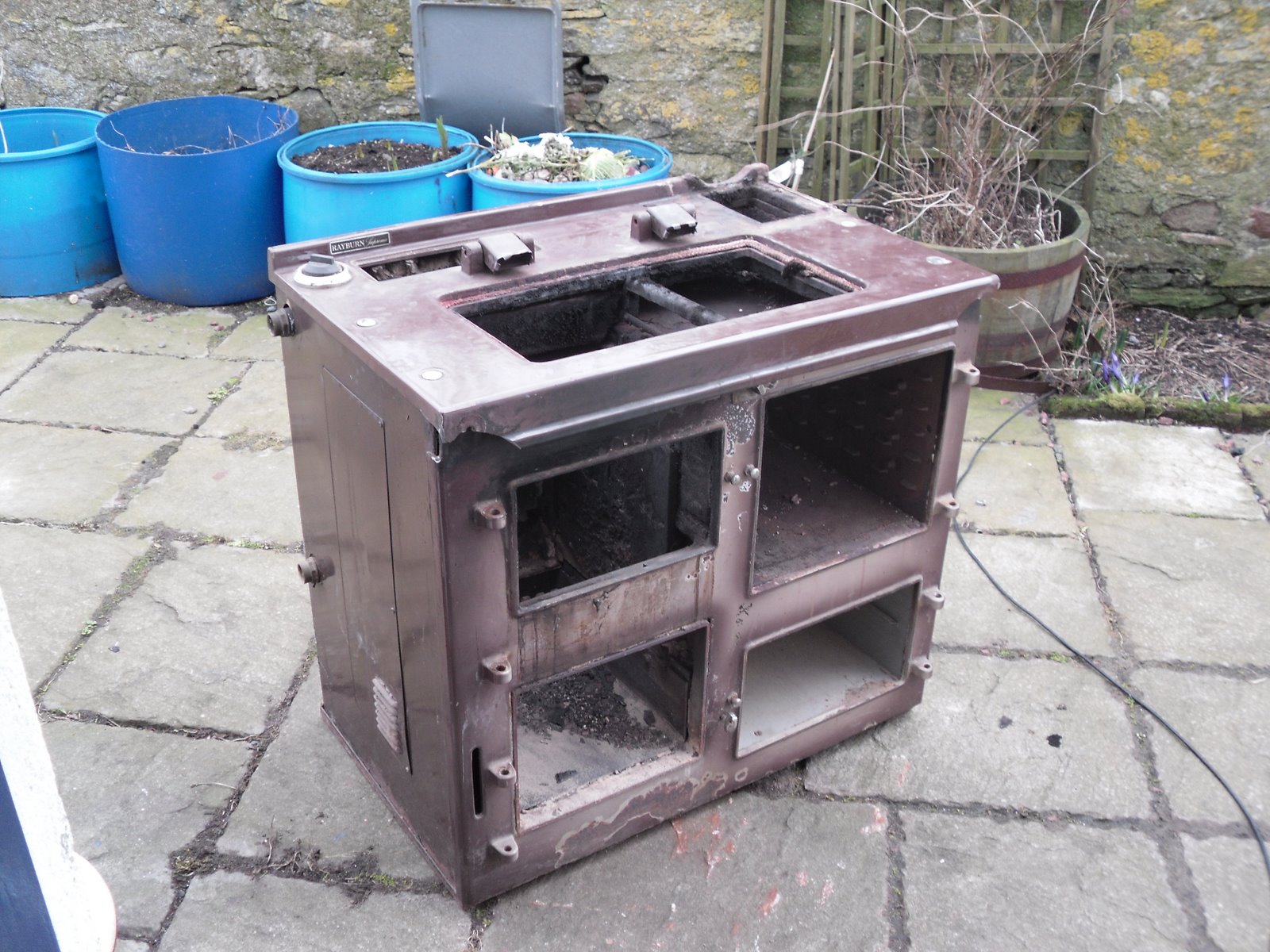 Truth to tell, it has been a good old friend in times of great freezingness, especially during power cuts. But it's not going far. In fact, it's so heavy I can't see it being possible to move it far, unless I smash it bits first. The idea is to turn it into a kind of outdoor kiln/oven, for super-lengthy peat-fired cookathons involving bits of sheep, cow, goose or hen.