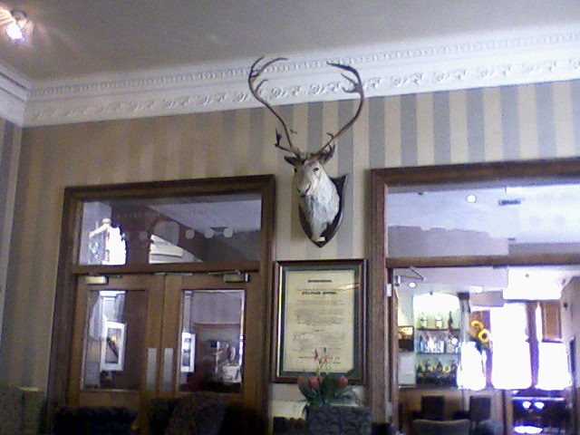 And so, after four hours on the train from Wick, I have reached Inverness. I have an hour here before the next train to Aberdeen, so I am now ensconced in an old haunt, the glorious foyer lounge of the Royal Highland (formerly Station) Hotel. Here you can hide behind giant plants, flop into comfortable couches and gaze at the sweeping staircase and old oil paintings, while a moulting stag’s head gazes down at you. It has always been my favourite Inverness retreat. More so before its (quite careful) modernisation.