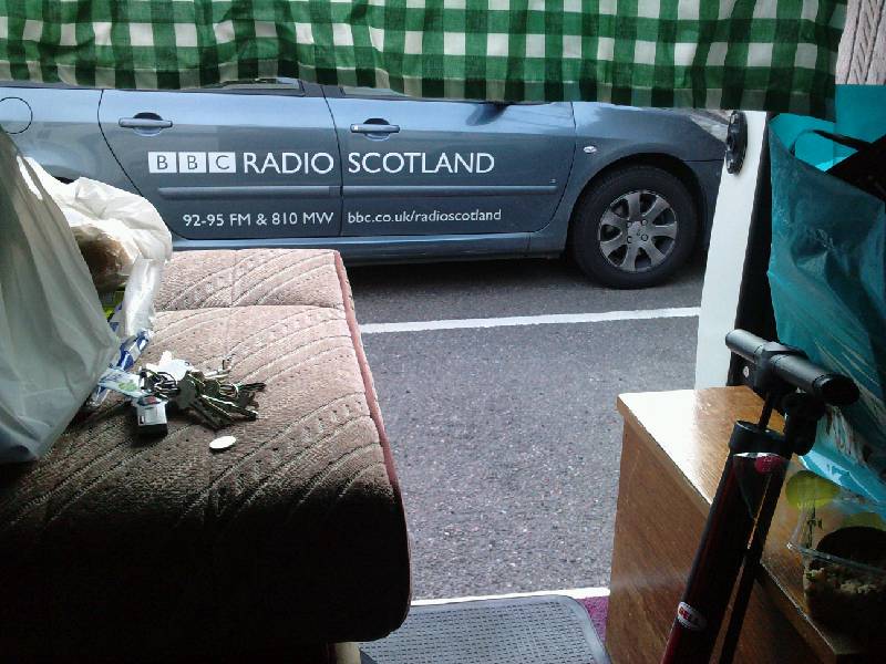 I was parked up, for old times’ sake, in the BBC car park. This was the site, some 14years ago, of my now-infamous period of living, weeknights and days in said car park, in a dubious Fiat camper soemone had driven from, funnily enough, Italy and abandoned in Cullen. That was an early morning show and sometimes I had to be physically extracted from said van, in no fit state to do anything, let alone present a radio programme.