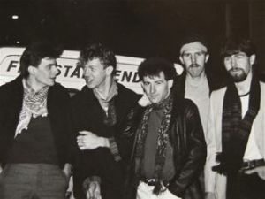 The initial lineup featured the Duffin brothers – Graeme, Stuart and Malcolm (guitar, bass and drums), all shown in the, ahem, posed picture – but did not last long. Graeme went on to fame and fortune with Wet Wet Wet and now runs the Foundry Music Labs recording and production studio. His daughter Esther O’Connor is a singer-songwriter. Stuart is now an acclained painter and printmaker. Malcolm, tragically, was killed in a motorcycle accident in the late 80s.
