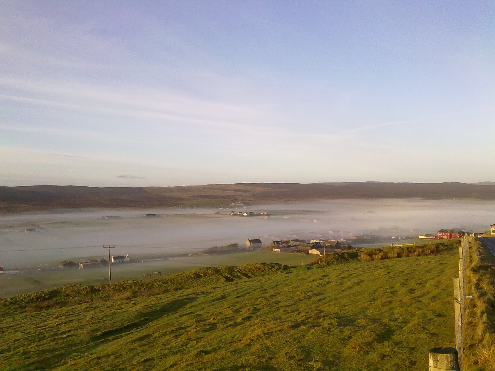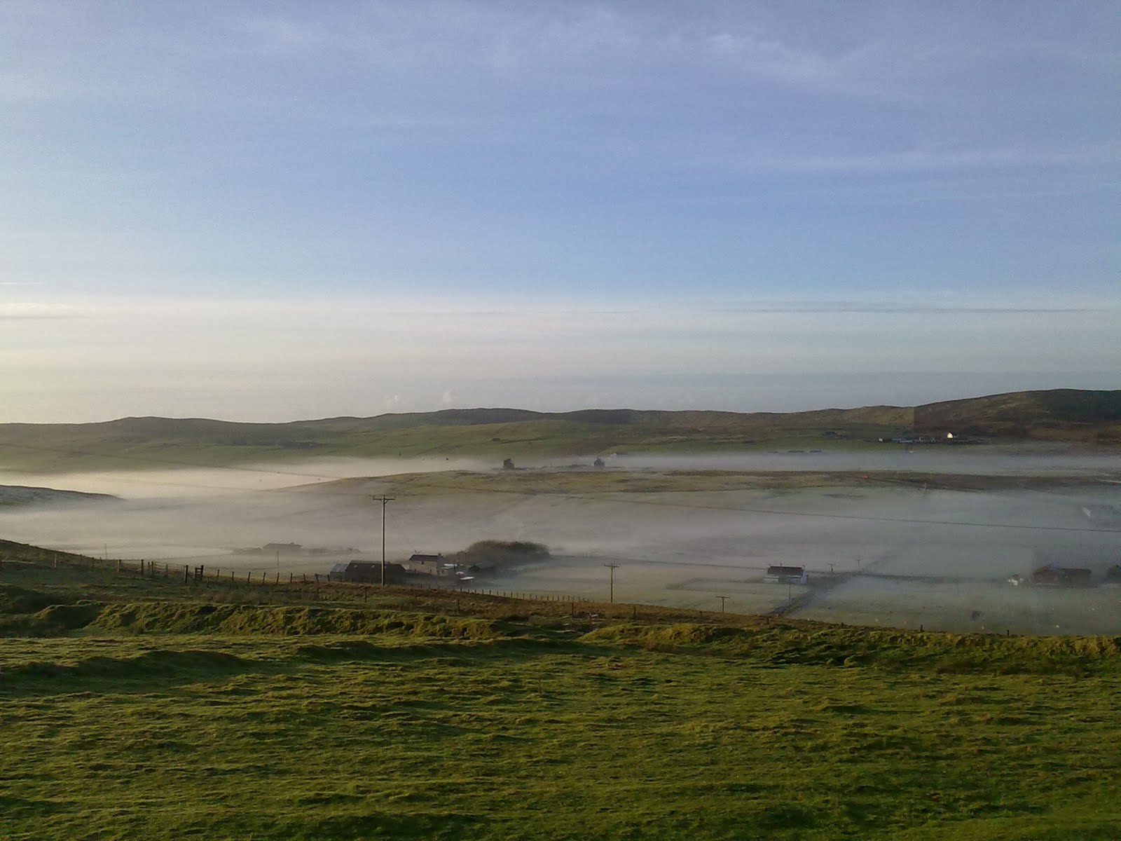 Anyway, the further south I got this morning, the more fog began to gather, until the Tingwall Valley (which contains an airport) was covered in a layer of sunlit mist. Lovely. But a bad sign for the Steve Earle gig tonight at Clickimin, which had to be cancelled due to freezing fog in Inverness.