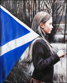 Alex Salmond, Scotland’s First Minister, wishes us a very merry Christmas with his official card, seen here. It’s a painting by Gerard Burns called ‘A New Journey’. I’m afraid it sent me off on a disturbing trip through Google Images. Hyper-realist art, flags, and young girls with blond hair? Some images cannot be redeemed from past associations.