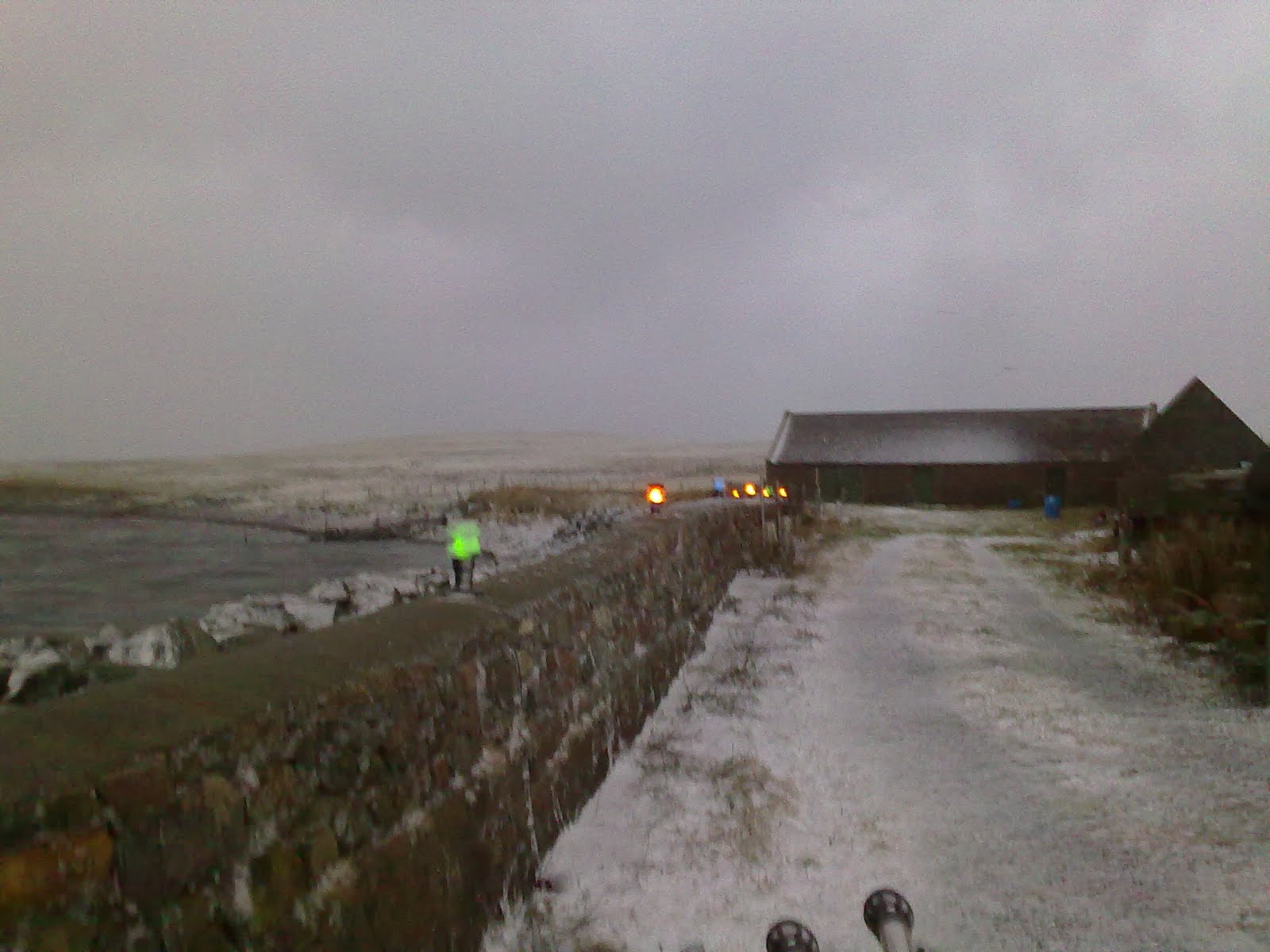 Very cold, windy and sideways snow that (so far) isn’t staying put. Forecast for tonight and tomorrow much worse, which is a pity because Mag’s on the boat tonight. Stove lit, generator filled with petrol, Citroen abandoned in favour of Isuzu double-cab 2.8-litre turbo diesel 4WD pickup. Economical? No, but it’ll go up The Clavie in 5th gear…