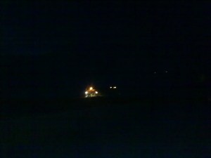 It’s a perfectly ordinary wee bus, but (so far) it has never failed to get through in sometimes apocalyptic conditions. Operated by Johnson Transport, the 35-mile run between Lerwick and Hillswick goes through probably the most exposed sections of Shetland’s landscape and connects with feeder mini-bus services from outlying areas such as North Roe, Ollaberry and Eshaness, and as well as passengers carries parcels of all description. On Monday night, in blizzard conditions, Gary Johnson, who owns the company, personally covered one of the feeder routes in a 4X4, while two council snowploughs led the other buses safely to their destinations. Tonight, things were more straightforward (clear and calm), but it still took a snowplough running ahead of us to guide us safely to Hillswick. That’s it retreating into the darkness after I was safely delivered to the house.