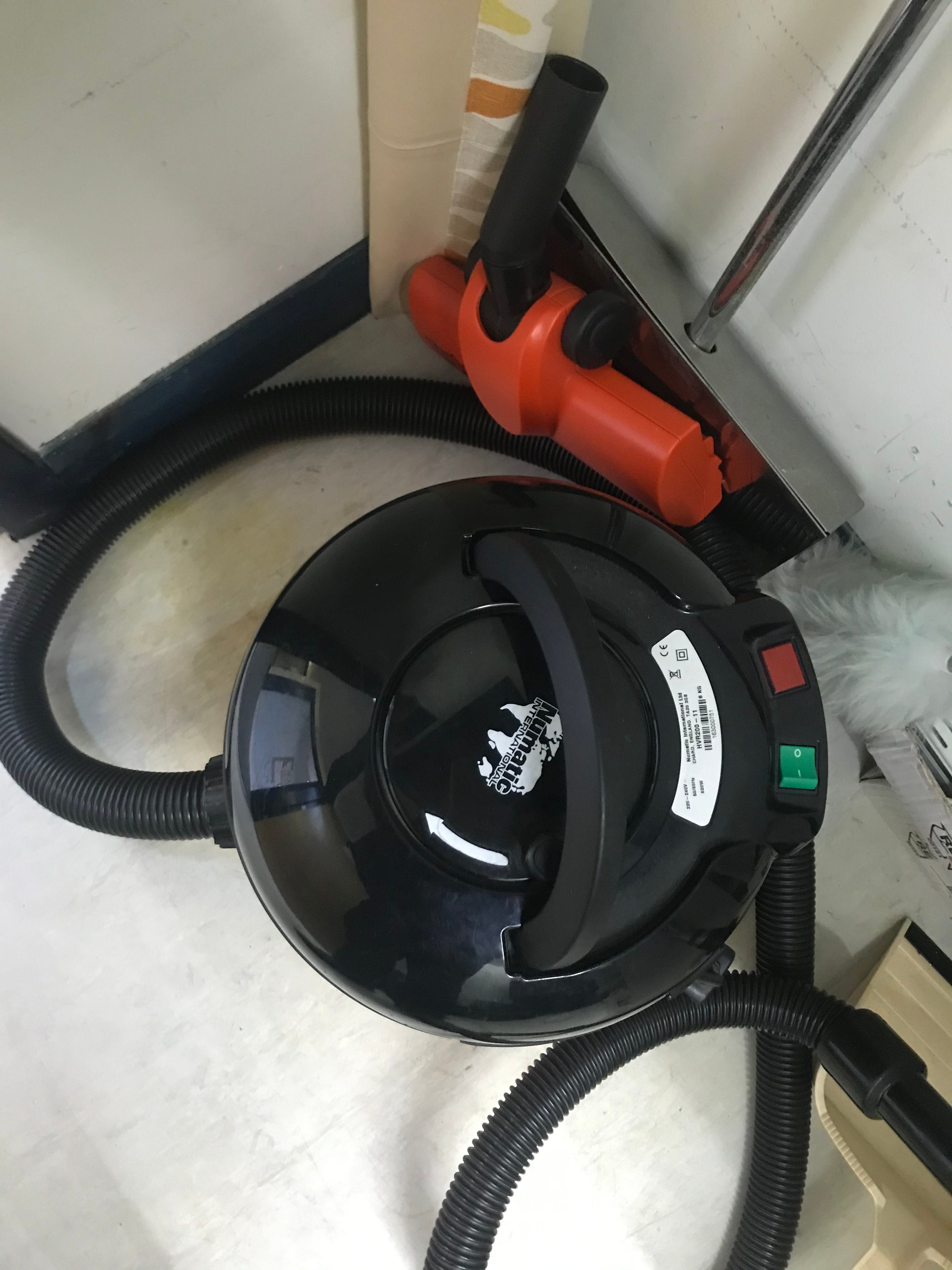 Henry has a hat and a little face. I’m not imagining this. I’m not hallucinating due to stress and I haven’t just munched some magic mushrooms or dropped a tab of acid. Henry has two little eyes painted on his cylinder, and his nose is the suction tube. If you see what I mean. Like an elephant’s trunk. Sort of. But much longer, and with the optional Turbo Brush attachment. I highly recommend the Turbo Brush Attachment.