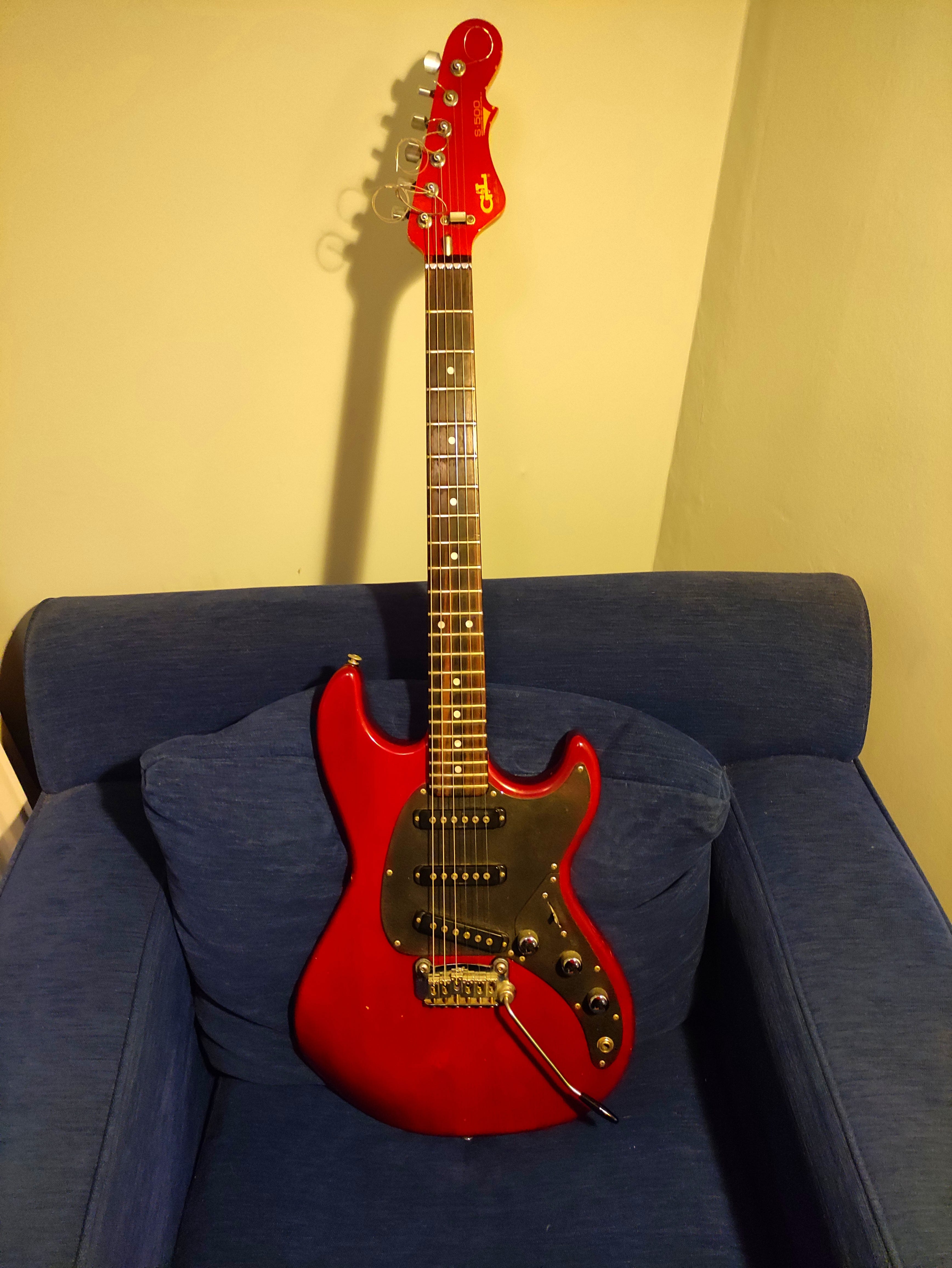 My first red guitar was a Hondo Strat copy. I bought it for £19 in maybe 1980 at the displenishing sale when Golumb’s music shop in Saltmarket, Glasgow closed down. It was white to start with, but I sprayed it red using tins of Ford touch-up paint from Halfords. I sold that to my friend Brian for £25. A bargain.