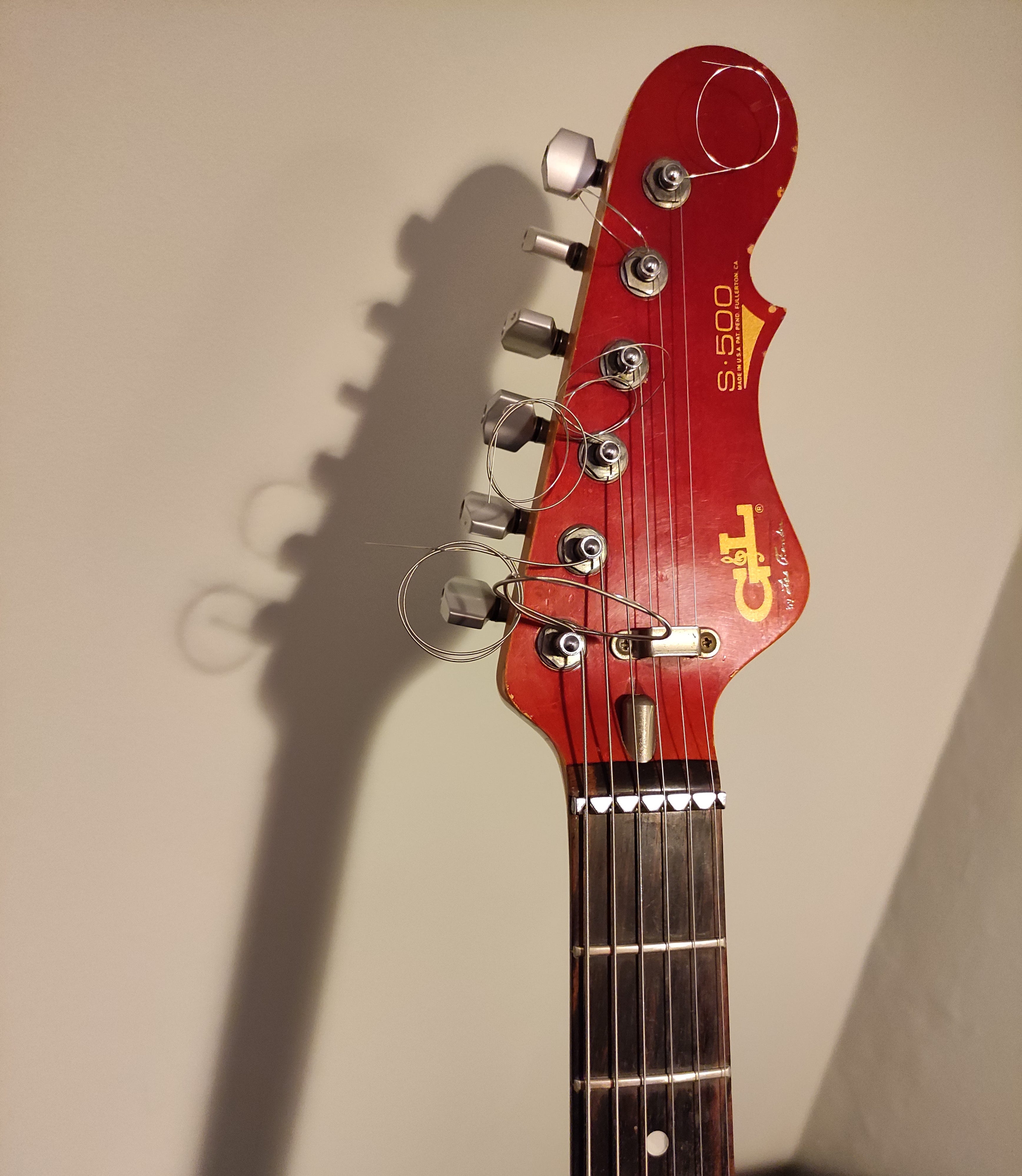 Back in the 80s, G&Ls were hand-built and incorporated all kinds of Fender (Leo) innovations. This S-500 has been in the wars over the past 34 years but it sports the original hand-wound high output pickups, the unique ‘dual fulcrum’ tremolo system, a sublime alder body which in places is thinner than a Strat and much, much heavier, and a stunningly slim fingerboard with metal nut and locking Speigel machine heads.