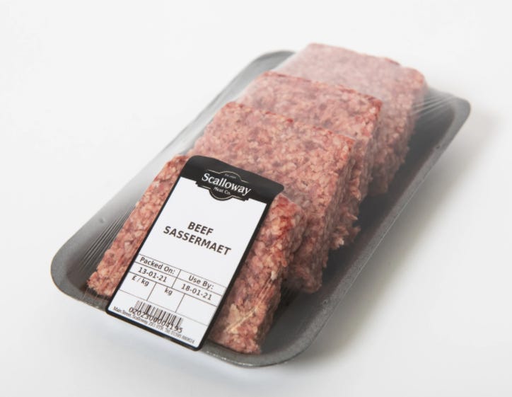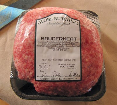 Sassermaet: A Shetland ‘delicacy’ made from ground, spiced and salted beef, occasionally lamb or mutton trimmings. As in the English ‘saucermeat’. Recipés range from district to district and family to family.