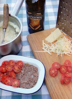 Clatch (Shetland dialect): literally “a smear”. Cooked sassermaet slightly liquified, with added potatoes, onions, tomatoes if available and cheese. In the approximate form of a hash or shepherd’s pie. Recipes vary.