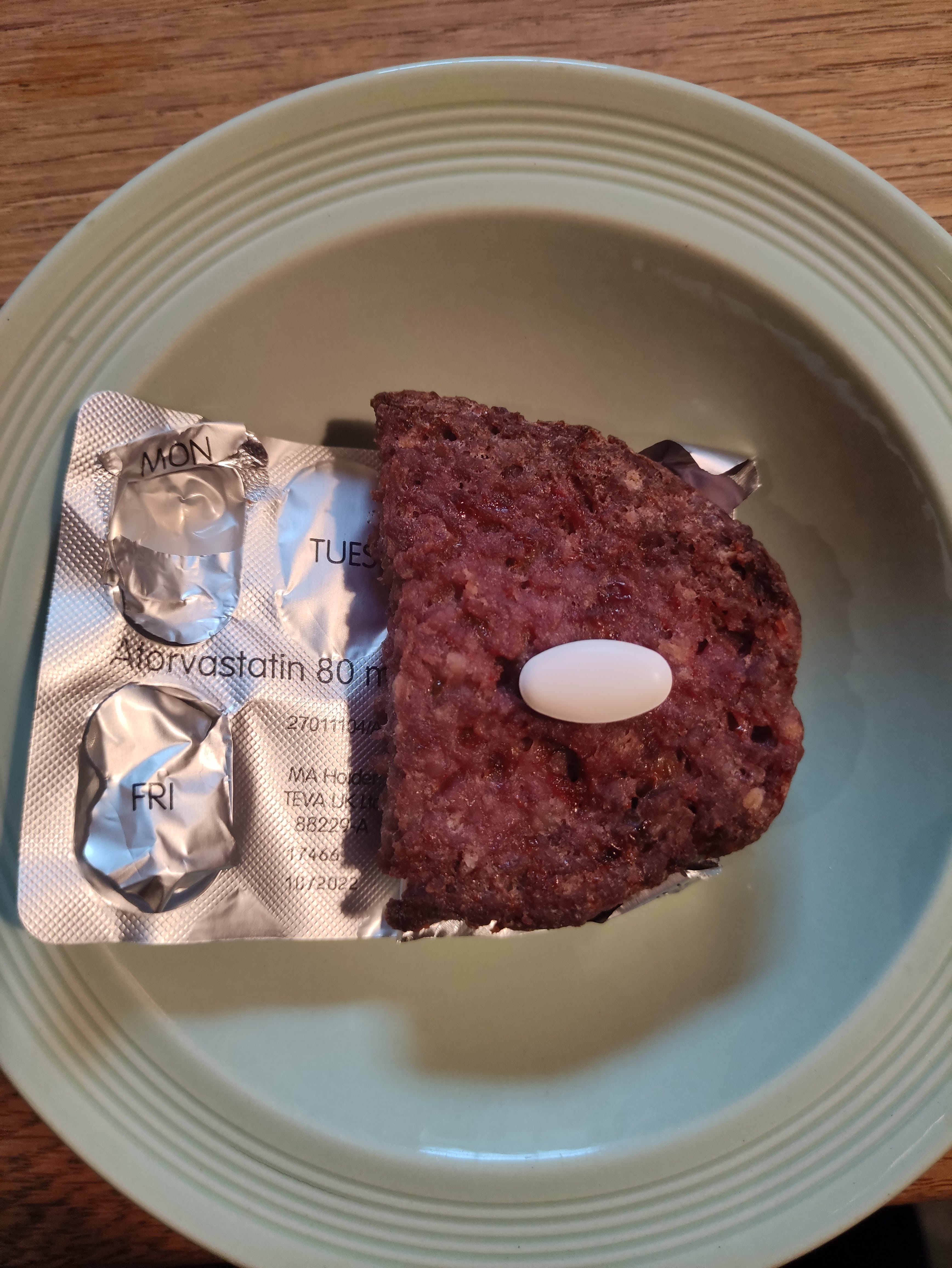 “The Death Slice,” said Perry. And we can market The Killer Clatch too, once we get the HIE grant for a factory. The council are already on board. Here. Make sure you take your pills.” And she handed Tark two rugby-ball-shaped white capsules. “160mg of Atorvastatin, four times a day.” She swallowed her own, then took a bite of the sassermaet roll. She grimaced.
