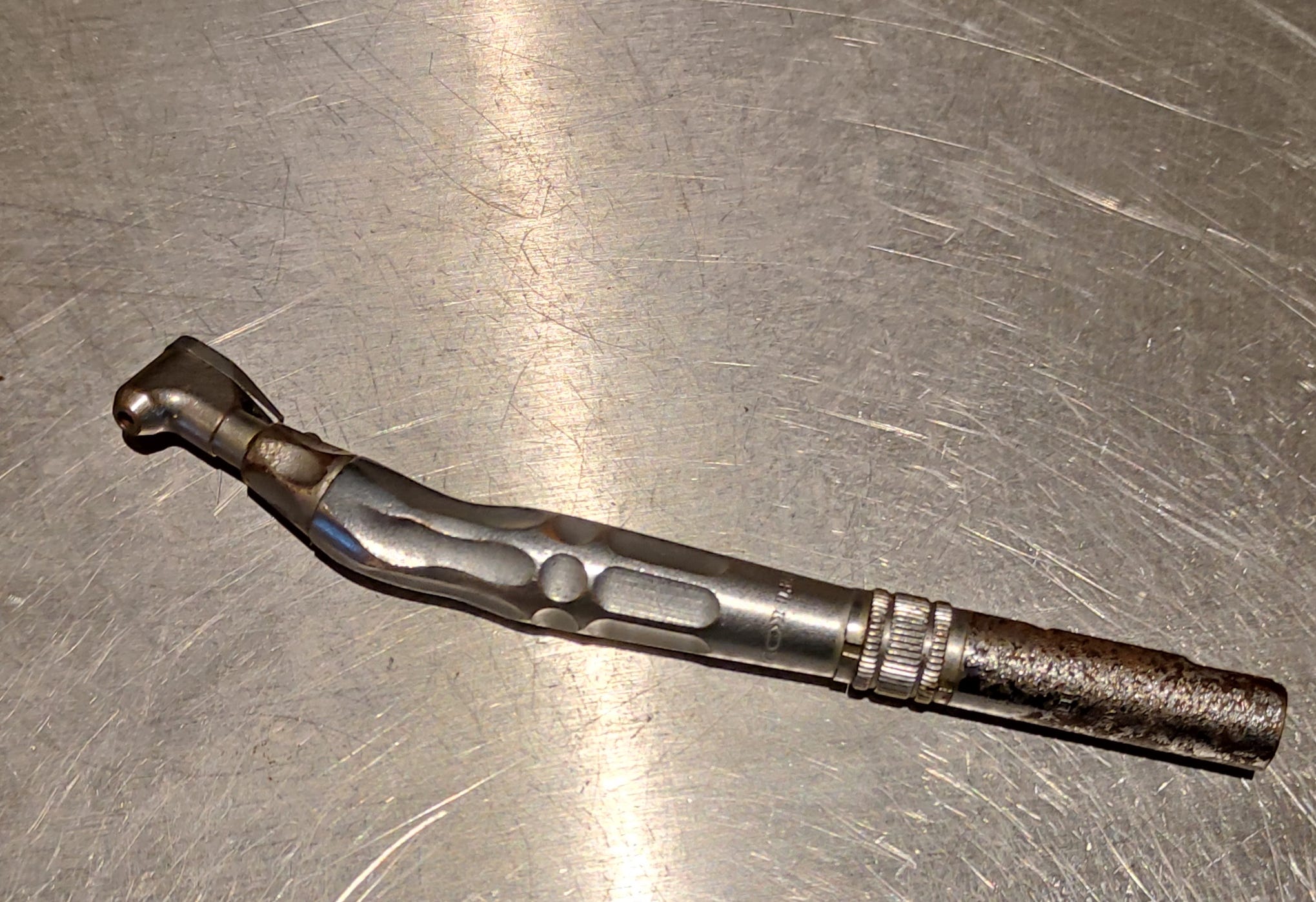In his last days he was concerned that a kilogramme of silver amalgam, waste from dental fillings he’d collected before his retirement, should be valued and sold. It turns out the mercury content now makes the package hazardous, so it has moved only from his garage to mine. I will get around to dealing with it. I know a scrap metal merchant who may be interested. A beautifully designed Italian dentist’s drill handpiece is the object of his I most treasure, its stainless steel worn by years of use, but retaining a space-age 60s beauty..
