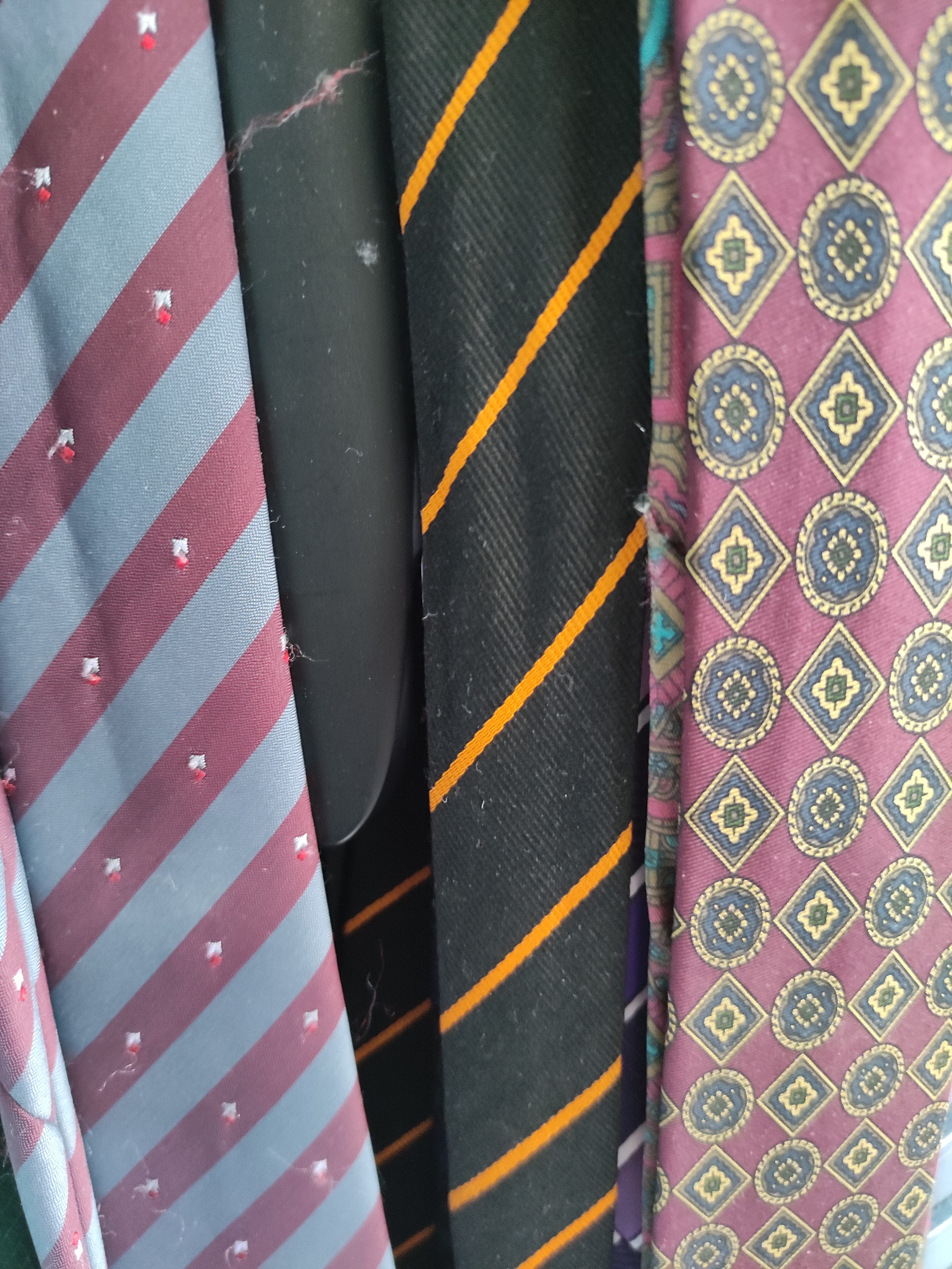 His ties. There are perhaps 50 of them. Glasgow University, the RAF Association. Glorious Paisley-patterned silk, strange lemony stripes. It’s doubtful I’ll ever wear them but the Brook Taverner and “Saville Row” shirts, the silk ones he had made in Hong Kong…well. They’re in my wardrobe anyway. So many, though. And those heartbreaking size differentials. He was so thin by the end. There was nothing of him. Nothing fitted.