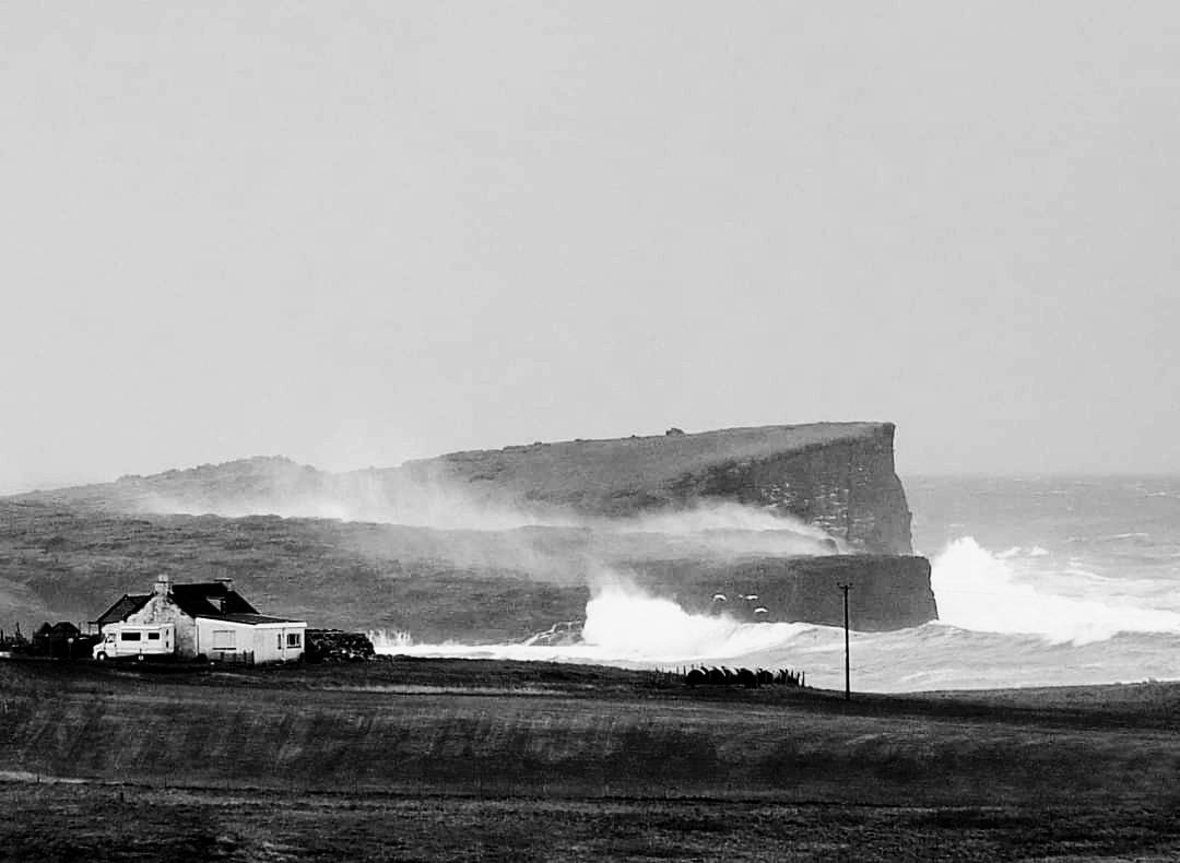 It’s been a week o’ wadder. Winds have been constant around 40-50 mph in our neck of the bog, gusting to 70 and beyond. Seas are very rough, rummelling up in the big south easterly. But we know these conditions. Fences are secured with condemned Citröen Berlingos, garden furniture weighed down with surplus reestit sheep. As dusk creeps in after lunch, I make sure there’s a flashlight handy (“is that a torch in your pocket or are you just…”) The power can’t last much longer. It’s already been off in some of the outer isles for days. Is there petrol in the generator? Enough. And I can tune the Rayburn to cope (after years of chimney fires); we’ve seen a lot worse.