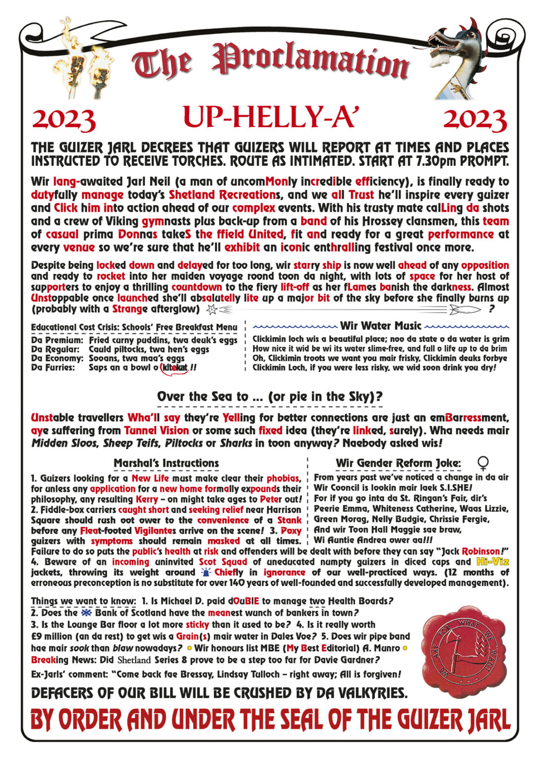 One thing is certain: the Town Hall reception for the Jarl Squad – all male, perhaps for the last time – will be presided over by a woman, as the council convener is for the first time female – Andrea Manson. Her speech will be worth listening to. The council leader is a woman, as is the chief executive.