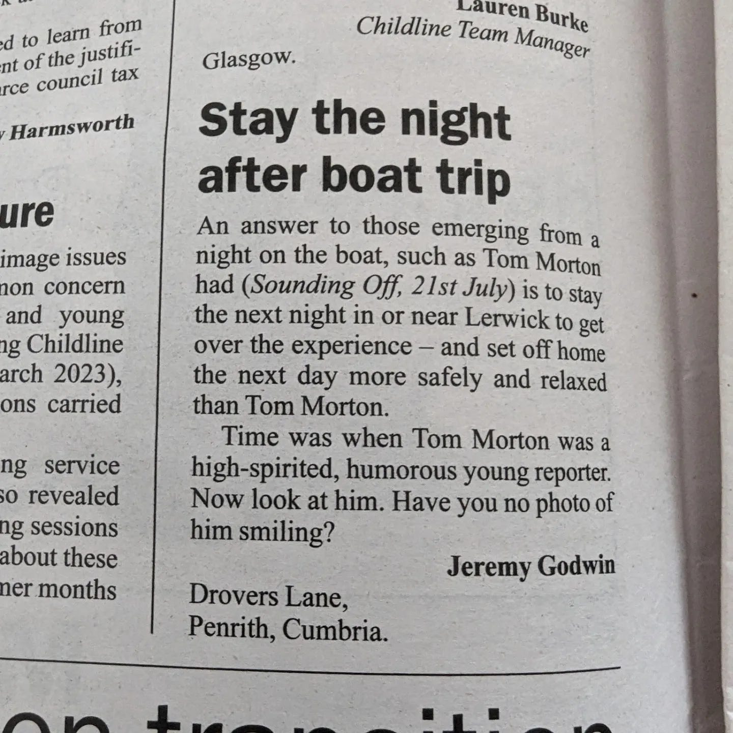 Somewhat surprised to see this letter In the Shetland Times from the legendarily correspondence-prone Jeremy Godwin. What could I do but