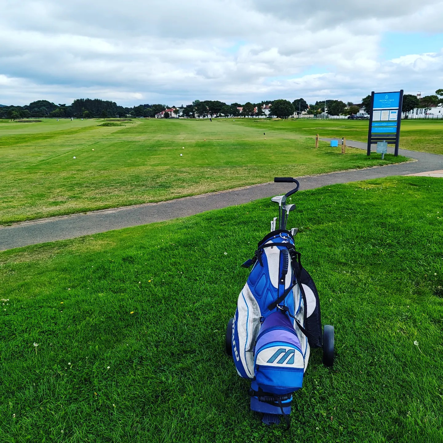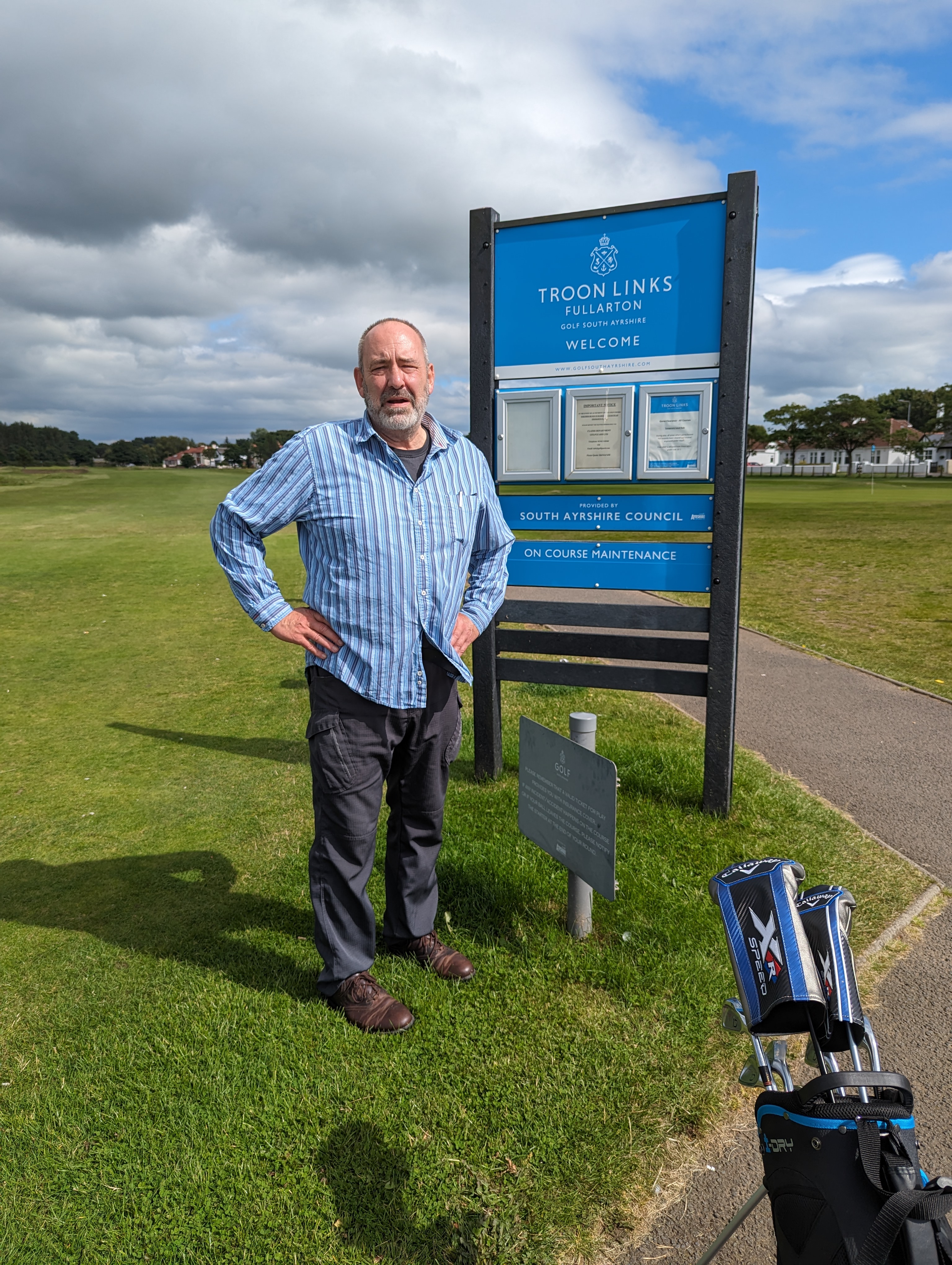 Our recent sojourns in Troon have made golf in all its grassy grandeur inescapable. I began to wonder if I could still swing a club to any effect. Bought an old set on eBay. Ordered a box of salvaged lake balls, and began pitching them at sheep, fortunately with no great accuracy. My brother-in-law, John, is a keen golfer and a casual conversation with him led inevitably this week to the two of us standing on the first tee at Fullarton. £30 each. And in golf terms, that’s cheap.