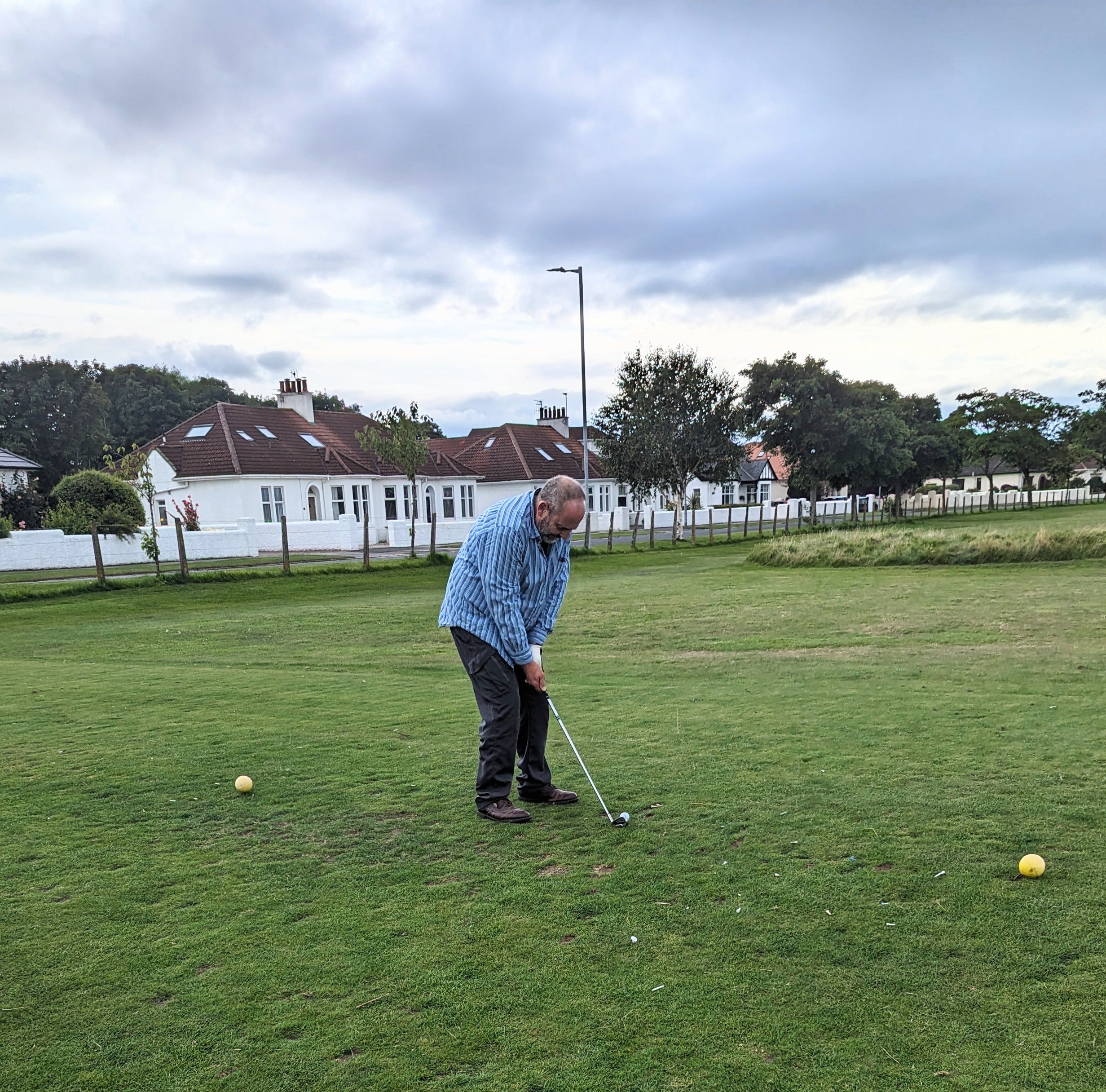 Our recent sojourns in Troon have made golf in all its grassy grandeur inescapable. I began to wonder if I could still swing a club to any effect. Bought an old set on eBay. Ordered a box of salvaged lake balls, and began pitching them at sheep, fortunately with no great accuracy. My brother-in-law, John, is a keen golfer and a casual conversation with him led inevitably this week to the two of us standing on the first tee at Fullarton. £30 each. And in golf terms, that’s cheap.