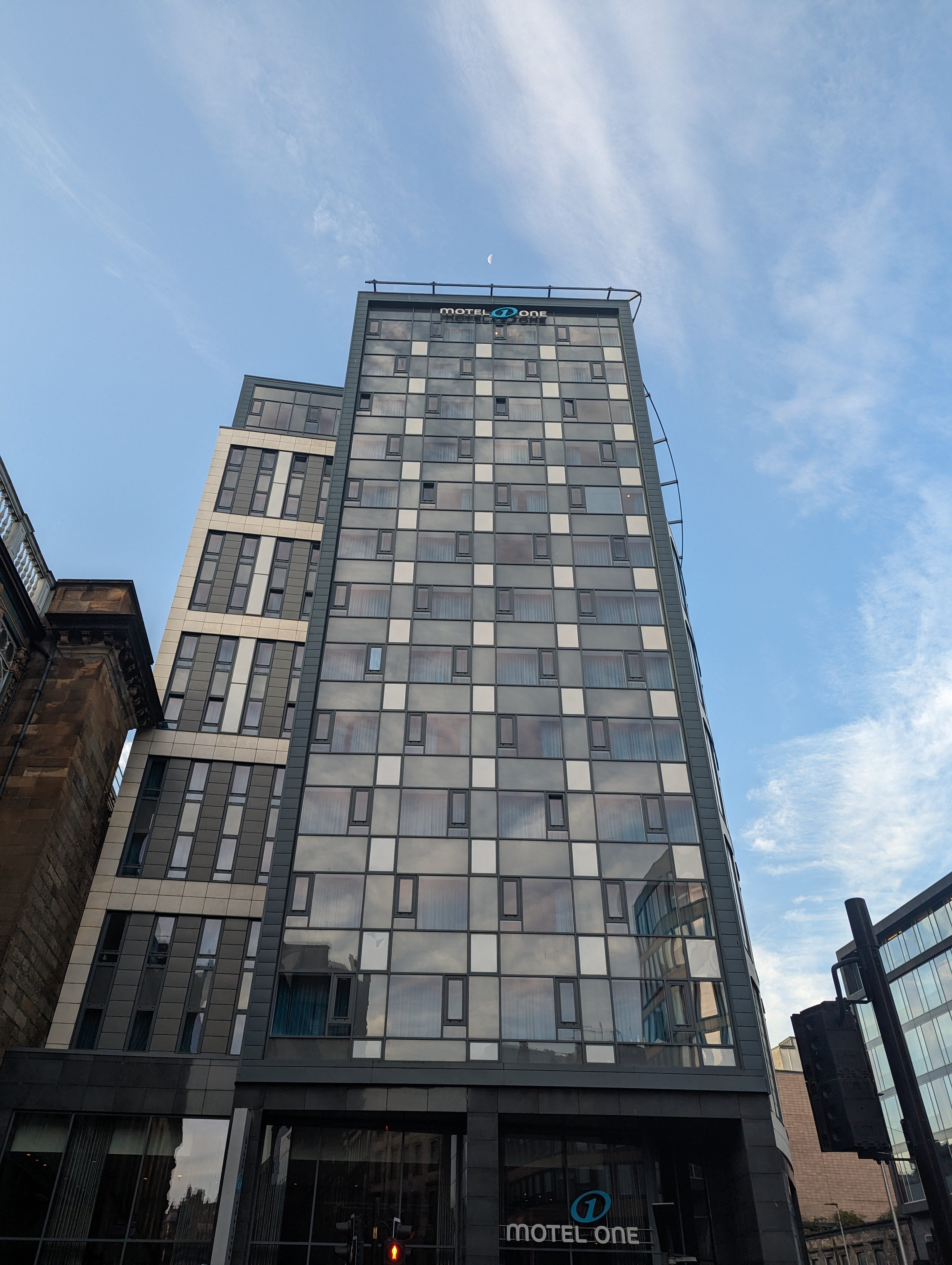 I’d booked the newish Motel One hotel next to Glasgow Central as I had the London train to catch next morning. It is German owned and somewhat odd, if very clean, with comfortable rooms and really excellent staff. There are, for some reason, a lot of stuffed sheep in the foyer. The check-in forms are in German and there is some really peculiar art on the bedroom walls (or at least there was on mine). “Oh, yes, the woman with the flowers,” said the receptionist. “We have had a few comments…”