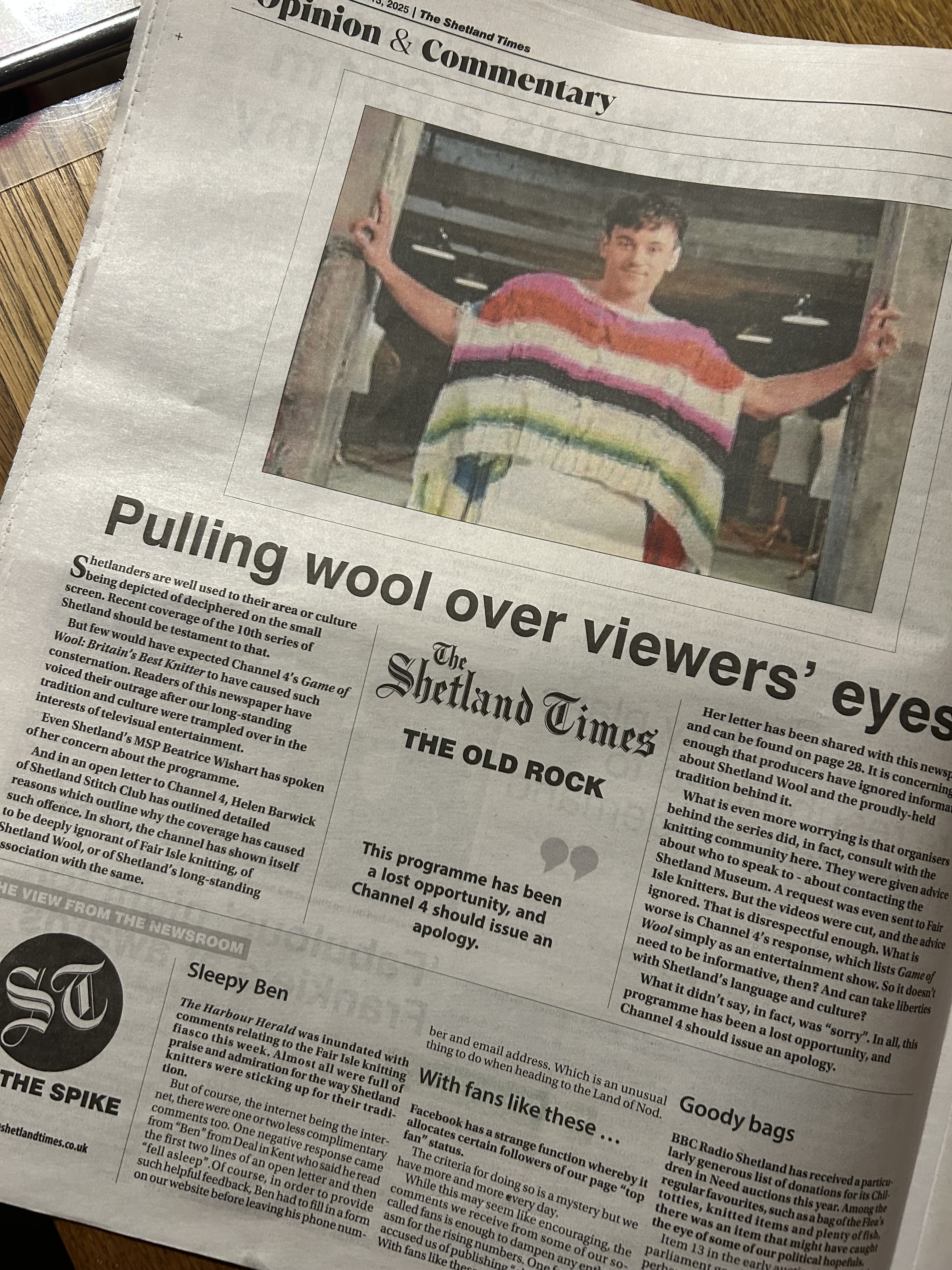 I live, of course, in the Shetland Islands, and since Game of Wool’s first cartoon attempt to traduce thousands of years of island culture, a growing tidal wave of rage has been building against the programme’s producers and the broadcaster itself. Even presenter Tom Daly is struggling to keep his head above the furious waters.