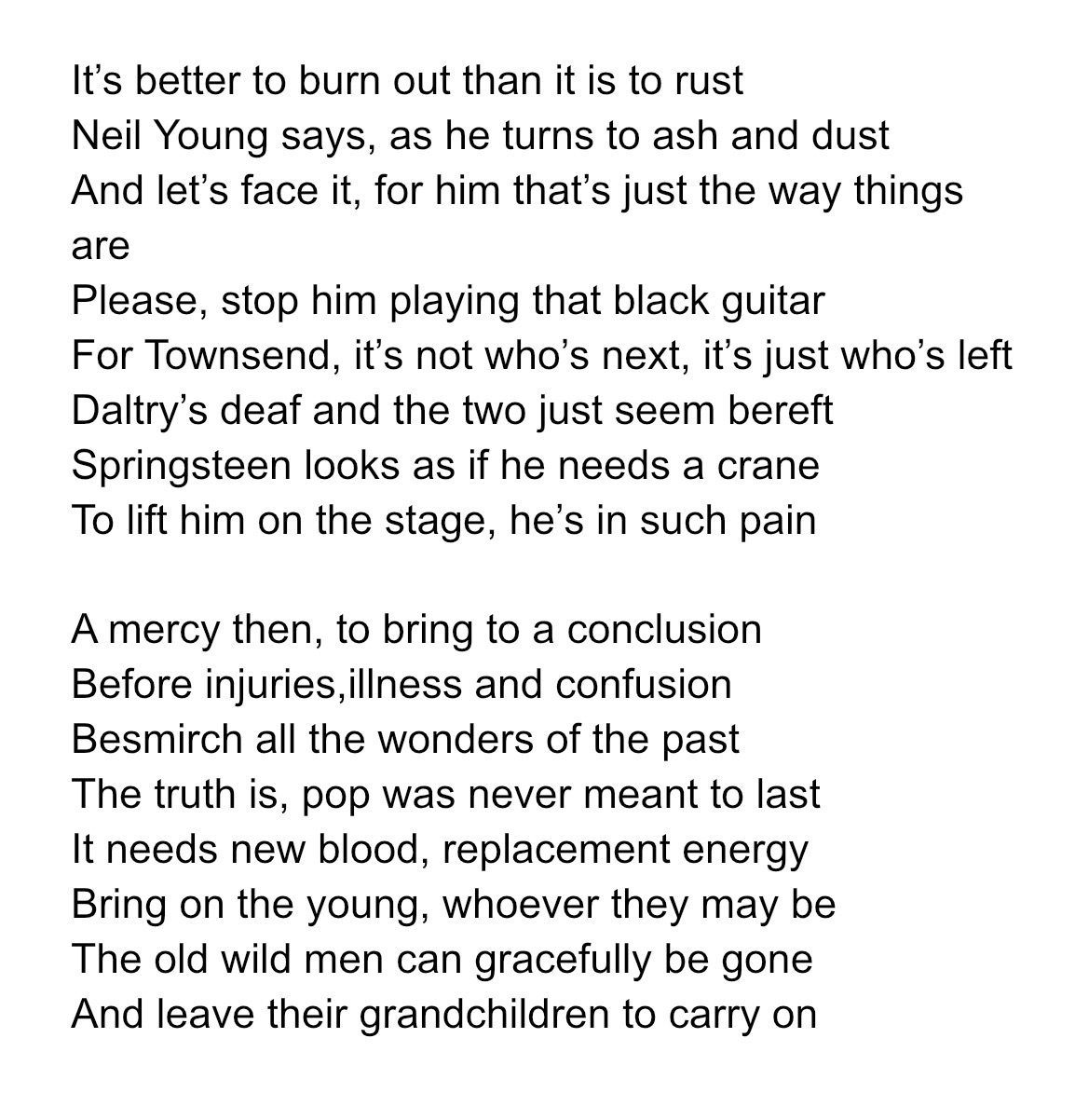 Here’s some doggerel on the subject. Oh, and Neil Young will be parading his lumpen thrash jams next year too, in Bellahouston Park, Glasgow. I would rather listen to the James Last Orchestra. Still touring, even though James himself last breathed earthly air a decade ago.