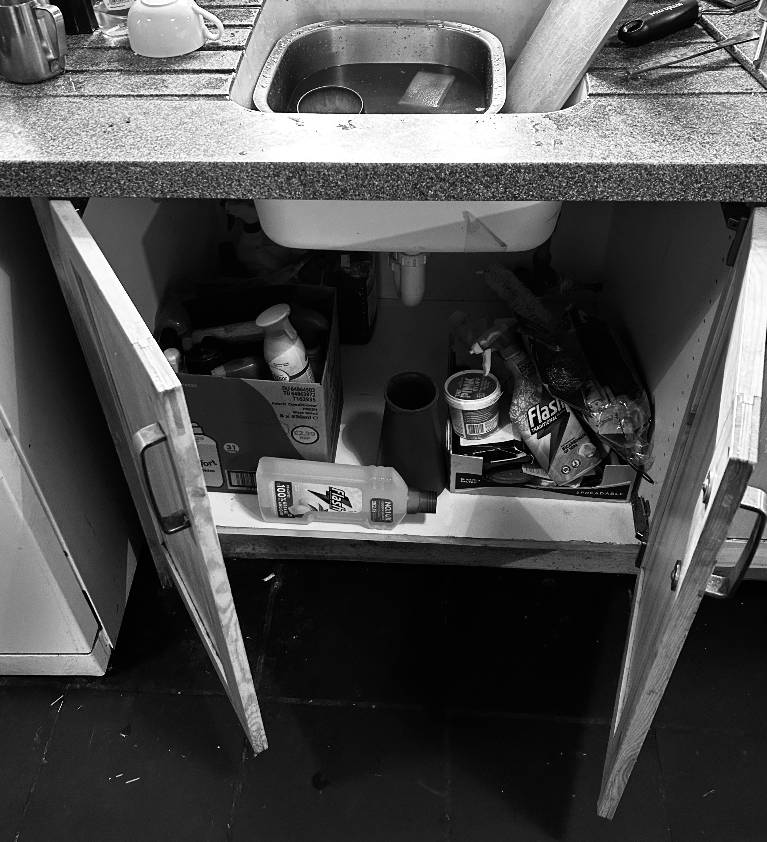 This week I have been under the sink with a vengeance. Attempts to revive a dying dishwasher (a machine, not some enslaved human)meant disconnecting plastic-on-plastic pipes that could only be accessed underneath our cool ceramic kitchen basin. Where I discovered a morass of suppurating horror amid the endless bottles of Flash, dog shampoo, Dettol, Brasso, saddle soap, Nikwax, rusting Brillo pads and whatever Pink Stuff actually is.
