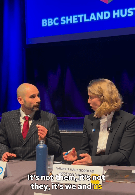 “This election is about who will be the best candidate to represent Shetland. This is not a referendum. If there is a future referendum folk can make up their democratic mind.” And as far as her leader John Swinney’s claim that there will be a referendum in 18 months or so, well: “2028 seems overly ambitious to me.”